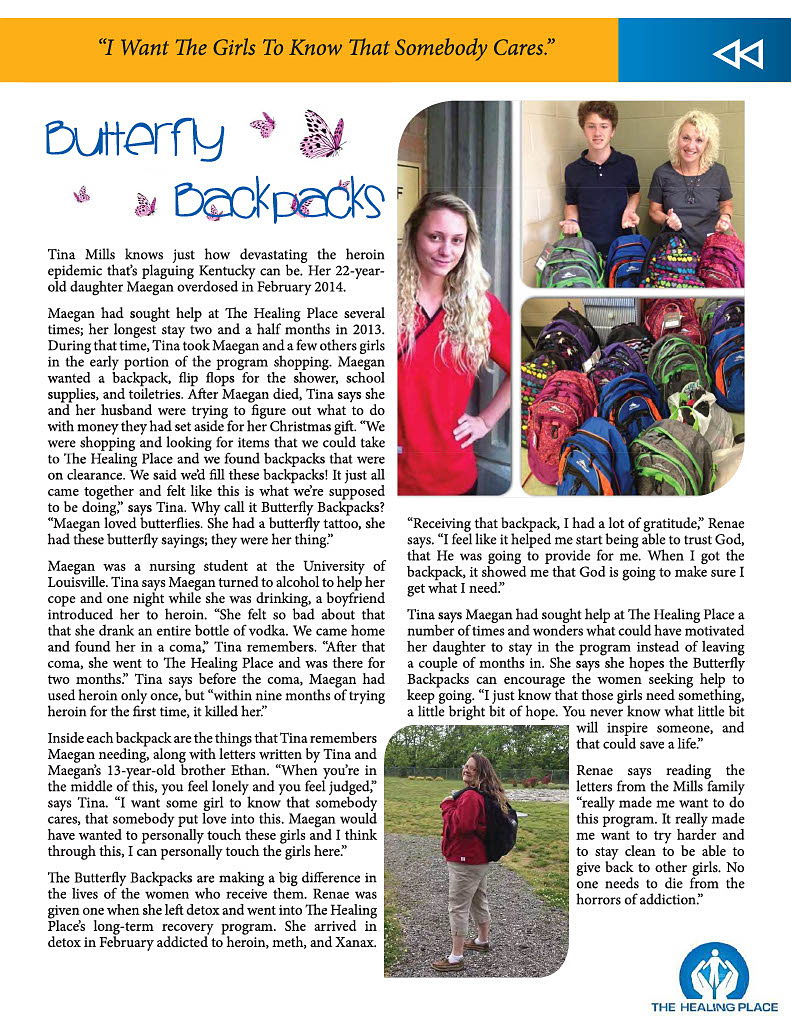 If we can save just one through our message that someone cares, it will all be worth it. Butterfly Backpacks assembles and delivers backpacks full of toiletries, encouraging notes and letters to individuals in recovery from addiction. It is our hope that recipients going through recovery will see just how much they are loved when they open a Butterfly Backpack and see all the personal items individually packaged with care. As they dig deeper in the backpack each person will read Maegan’s story, letters from her younger brother, sister and mom, and see the beautiful hand drawn butterflies made by our family friend with Down Syndrome, Jill. Jill says, “each butterfly is exactly as it should be.” These individuals are exactly on the journey of healing they need to be and they need to know someone is cheering them on in their very difficult battle. Butterfly Backpacks is the family that will partner with addiction recovery centers like The Healing Place to love and support each person through recovery. We have donated over 5000 Backpacks to The Healing Place! Every dollar donated goes directly to providing another Backpack and saving another life. Truly Butterfly Beautiful!